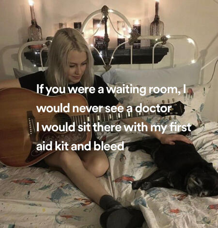 waiting room by phoebe bridgers is a heart wrenching song that she wrote when she was sixteen, she states that shes now embarrassed of what she wrote even if its a fan favourite for its raw description of desesperation and sincerity